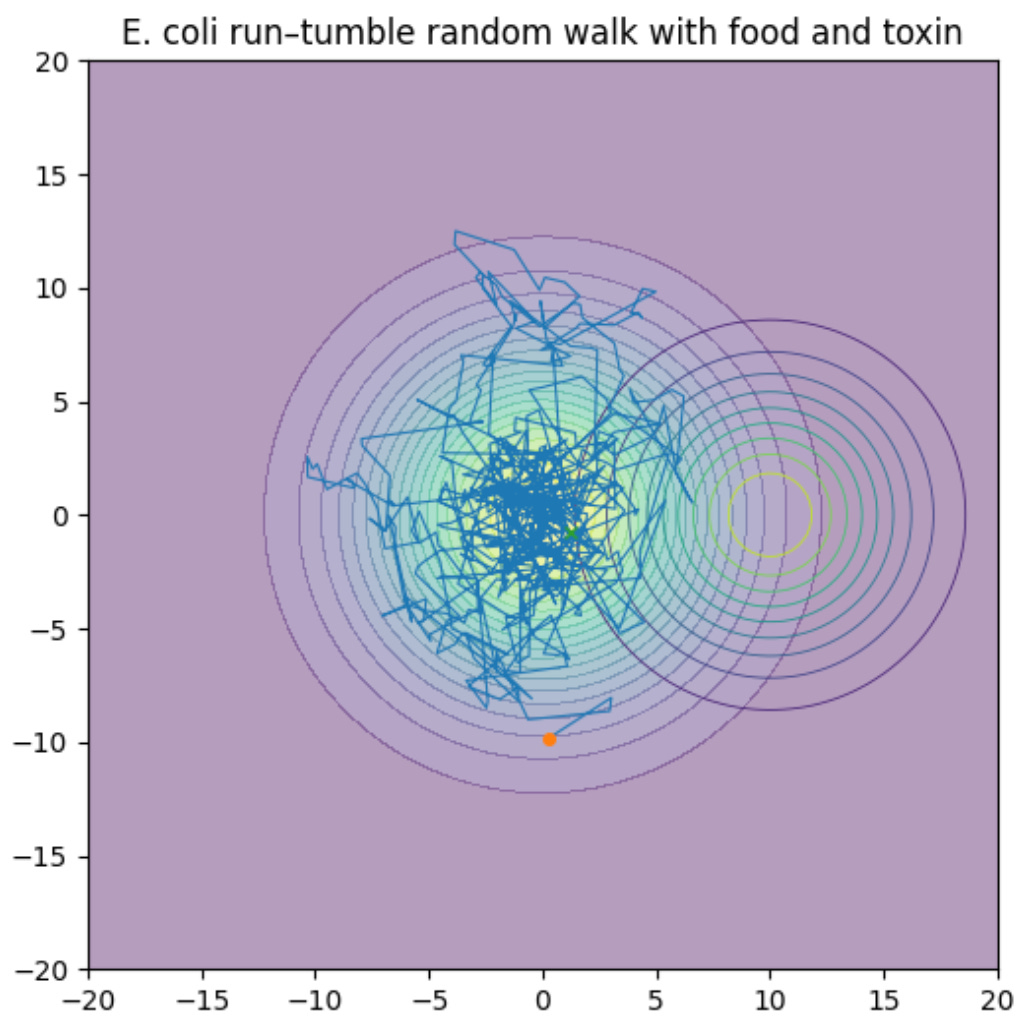 У бактерии также есть средства воздействия на мир — жгутики и два базовых режима поведения: прямое движение и случайный поворот. Если условия улучшаются (например, растёт концентрация питательных веществ), бактерия с большей вероятностью сохраняет текущее направление движения. Если условия ухудшаются, она чаще меняет направление. Этот простой алгоритм позволяет бактерии находить питательное вещество и избегать токсина.